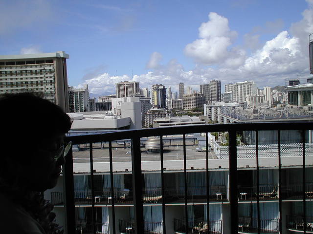 自室のバルコニーでおにぎりの朝食、すばらしい眺めがご馳走。青い海と波の音、絶えないさわやかな風の中でのんびりしていると、こぼした米粒に小鳥がよってくる。19階から見える隣のホテルのベランダでのんびりしている人たちを見ながらリゾートとはこういうものかと思いつつ午前を過ごす。