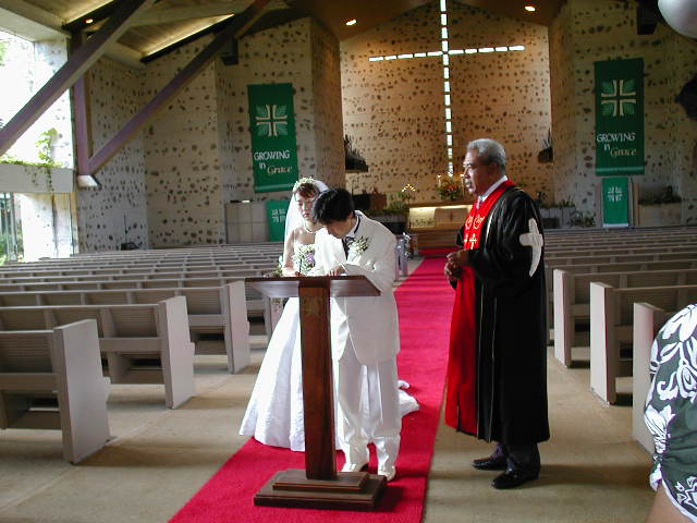 教会で参列する友人たち6、7名とともに式の打ち合わせをしたり会場風景のスナップ撮影をしながら、この教会はホノルルでは最も古いもので教区の人々が持ち寄った火山の石で作ったという歴史をトンガ出身の牧師から聞く。