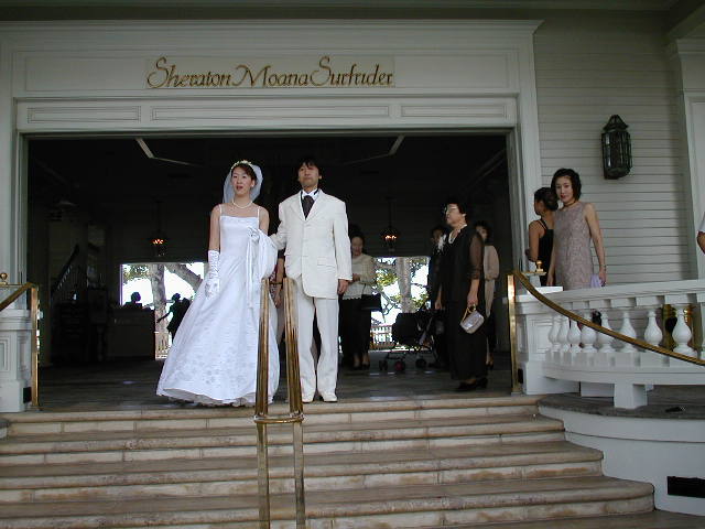 昼過ぎ、式服にきがえて1階ロビーで参列する親族たちと待機するうち、ウエディングドレスの眩しいような新婦の亜紀さんと白スーツの昭彦が現れ、ゆっくり撮影する間もなく待機していた長い白色のリムジンタクシーに同乗して式場のチャーチへ出発する。ホテルの古風で大きな玄関や植え込みによく似合う映画のようなシーンであった。