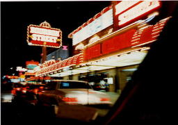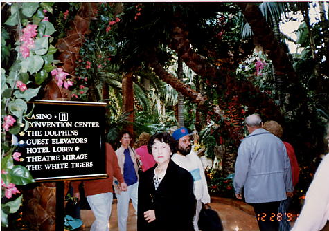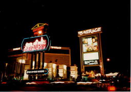 早速、レンタカー「GMコルシカ」を借り、数キロ先に見える派手なネオンの海に向かう。近づくにつれて大きくなるホテル群とけばけばしい装飾をを見上げながらネオンの街をしばらく進み、中でも最大のホテル「ミラージュ」の前に到着。客室3000の見上げる巨大建物、前庭の熱帯樹林と火を噴く噴火山という大掛かりな装飾にしばし眼を奪われる。 |